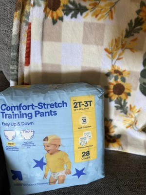 Up & Up Boys Comfort-Fit Training Pants are easy up & down diapers, the size 2T-3T are for up to 34lbs babies, it has a great boys design and the has a 12 hours leak protection! These diapers has a double layer leg barrier to prevent blowouts and a 360 degrees stretchy underwear-like fit, they are soft at touch and my baby skin stay dry. They are playtime resistant!