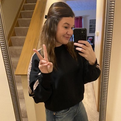 I purchased this in the black, but ultimately returned them for a few reasons. First, the material is more of a scuba knit rather than a regular sweatshirt material. I am not a fan of that type of fabric. Second, the lace was much more pink than I expected. It looked more cream to me in the photos online. It also ran a little large.