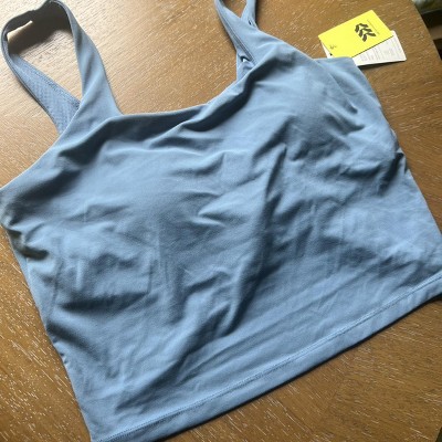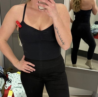 I really enjoy these as they have a built-in cup and provide a lot of coverage so you could wear this as a shirt or an extra long sports bra. The criss cross back is a cute detail. I would say true to size, but if you’re a borderline size up.