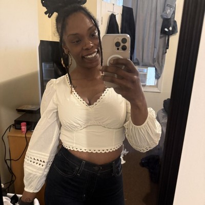 I give it four starts- it’s adorable- the eyelet detail the puff sleeves the crop style. It really is a cute top. However being an athletic girl it’s a nightmare to get on and off i think i sized up to a med usually a small but there is no stretch. Still fit ok but due to lack of stretch i will be returning- cute for petite girls
