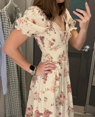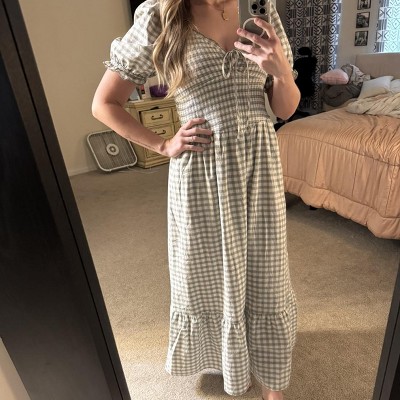 From casual outings to holiday evenings, this Western Puff Short-Sleeve Smocked Midi A-Line Dress from Universal Thread™ is a perfect choice for casual occasions. Made of 100% cotton, this midi A-line dress offers all-day comfort. It features a sweetheart neckline with front ties and has a smocked bodice to help you find the right fit. Designed with short puff sleeves, it's finished with a ruffled hem for a graceful look.