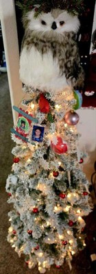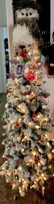 [This review was collected as part of a promotion.] This tree is pretty and the warm white pre-strung lights look beautiful at night. It does drop quite a bit of the white flocking, so just be prepared for a little cleanup. It’s slimmer than I expected, which would make it great for someone with a smaller space, though I personally wish it were a bit fuller. I used my usual ornaments and I’m still deciding if they’re a little big for the tree, but overall it looks lovely once decorated.