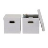These storage bins with lids are sturdy, stylish and the perfect storage solution for any space. Each bin is made of a thick, textured linen-look fabric that’s more hardy than the material of standard storage cubes. The fabric lends a luxe look and feel to what might otherwise be a standard issue storage solution. Each bin has a lid that lifts off easily and fits securely, along with two wide handles for easy transportation. Each handle has a chromed grommet lining, adding to the upgraded look and feel while also improving the experience of lifting, carrying or pulling on the bins. Each bin is easy to collapse or assemble and has fiberboard sides along with a fiberboard base and lid, which keeps the bin sturdy and stable when assembled. Use these bins to keep papers, office supplies, accessories, shoes, clothing or other miscellaneous items organized and tucked away. These bins fit perfectly inside standard size cube organizers, though they’re stylish and practical enough to stand on their own. Because of the sturdy lid, these boxes are easily stackable, and the lid offers protection for the items inside the bin when not used in a cube shelf. Keep them on other shelves and surfaces, inside closets or under the bed, or anywhere you need to add smart storage. Each bin has a weight limit of 15 pounds. To clean a bin, if necessary, spot clean with a mild detergent and let it air dry. To assemble the bins, unfold and insert the base panel.