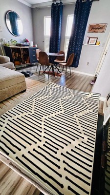 [This review was collected as part of a promotion.] The rug seems durable and the design is ok! In person, it reminds us a bit of zebra print so it didn’t fit our adult boho-geometric aesthetic as much as we thought it would. It is quite soft and would be great in a colorful room to bring a neutral feel to it. It would also look nice with tans! Just not for us, unfortunately!