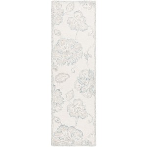 Transform your home decor with this exquisite runner rug in ivory and blue. Measuring 2 feet 3 inches by 8 feet, this hand tufted piece from India is a perfect addition to any hallway or entrance. Crafted from 80 percent wool and 20 percent cotton, this rug offers a lovely combination of comfort and durability. The country floral style brings a touch of elegance, adding warmth and charm to your space. With its 1/4 inch height, this rug provides a smooth transition across different areas of your home. Its harmonious colors and timeless design make it a versatile accessory that complements various decor styles. Whether placed on a hardwood floor or layered over carpet, this rug enhances the aesthetic appeal of your living area. Embrace the beauty and craftsmanship of hand tufted textiles with this delightful addition to your home.