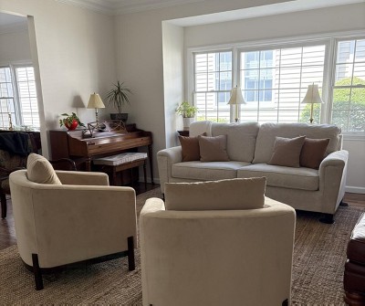 This chair is covered in a velvet-like fabric and is a light tan color. It arrived assembled, except for the legs and took about 30 min to unwrap and attach legs. I love the wood trim and fabric feel. It does show a change of color when you run your hand over it. Seat cushion is stiff but comfortable. Back cushion is soft. Chair is sturdy. My husband is 6 ft and I’m 5’3”… Seat depth was good for both of us as it’s not too deep.
