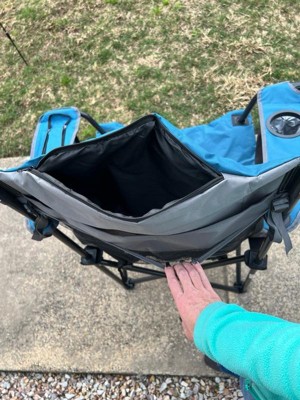 [This review was collected as part of a promotion.] Overall, this chair is really comfortable for a camping chair! It has a lot of bells & whistles like a built-in cooler and wine glass holder. It is very durable compared to other camping chairs. My only feedback is that it’s very heavy for carrying long distances. I don’t plan on taking it on any backpacking or camping trips, but moreso plan to use it for tailgating, etc. Also, be very gentle putting it back into the carrying bag. The first time I put it back in, one of the seams from the carrying case ripped.