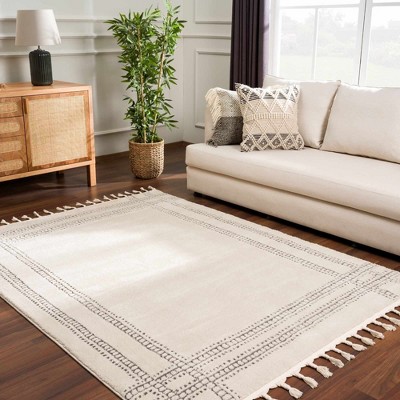 Brand: Hauteloom. Collection: Bansi. Colors: Beige, Black. Construction: Machine Woven. Material: 100% Polypropylene. Pile: High Pile. Pile Height: 0.74". Styles: Modern Geometric. Backing: Jute. Made In: Turkey. Thickness: 0.86". Fringe Length: 1.6"