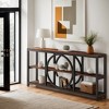 - Our console table features a distinctive circular frame with a wooden finish and metal accents, blending farmhouse charm with industrial flair to create a unique style statement in any space.