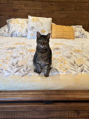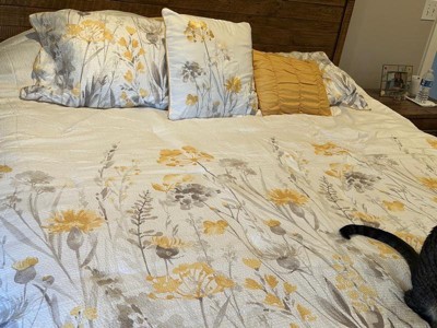 [This review was collected as part of a promotion.] Now that spring is here, I was happy to tuck away my heavier comforter and bedding and dress my bed with this beautiful set from Madison Park. The comforter has a quilt like look but with a lightweight feel and the most lovely floral design in yellow, gray, and white. The set comes with 2 shams and 2 decorative pillows. One small pillow is a contrasting gold color, and the larger pillow has the same design as the comforter but with an embroidery design. It's the perfect queen size fit with plenty of room on the sides and foot of the bed. Absolutely gorgeous!