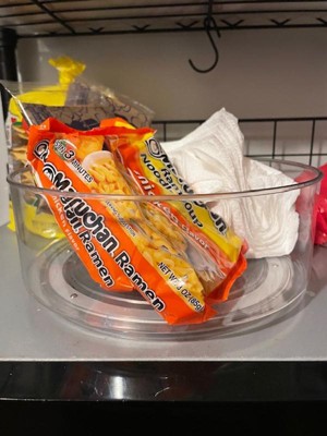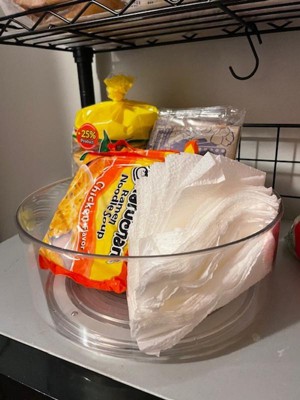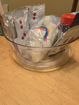 I like that this is large enough to fit several items. It turns smoothly on my table top. I like that it is clear so everything can be easily seen. I currently use this as a hot cocoa bar storing packets of hot cocoa, sprinkles, marshmallows, and candy. This container makes it easy to organize.