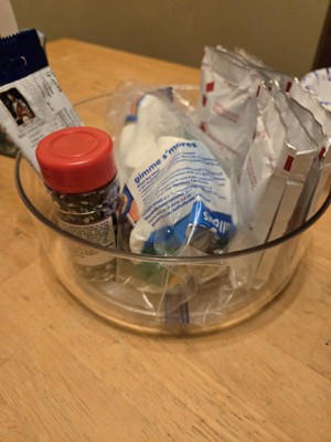 I like that this is large enough to fit several items. It turns smoothly on my table top. I like that it is clear so everything can be easily seen. I currently use this as a hot cocoa bar storing packets of hot cocoa, sprinkles, marshmallows, and candy. This container makes it easy to organize.