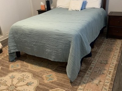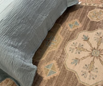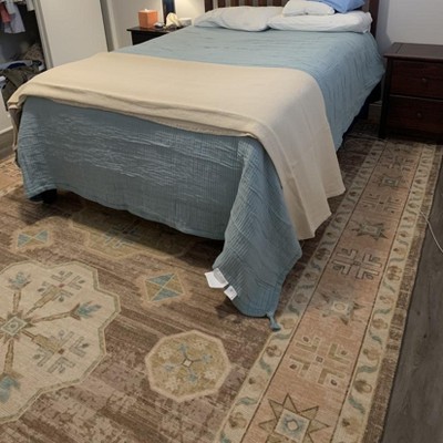 This is a pretty area rug, brown is very in this year and this rug is a warm peach brown. It lays flat right away and has a nice texture under your feet. The border is pretty.