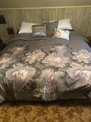 7 Pcs Elegant Watercolor Floral Print Cotton Comforter Set, All Season Chic Transitional Look Home Textile for Lux Bedroom Decor, Grey, Cal King
