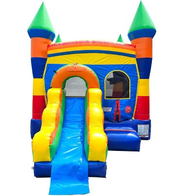 Bring a durable, commercial bounce house to your backyard! Our combination bouncer house for kids features a slide so kids can bounce and then go down the slide. The built-in bladder misting system easily connects to a standard garden hose and lets your children cool down during the hot summer months. Plus there's a basketball hoop for fun games! Our Crossover line of products are constructed with strength, fun and safety in mind. We use durable vinyl to ensure a fun experience for the little ones. Kids can jump and play basketball then go down the wet water slide. The fun simply never ends! The inflatable has a 90 day Limited Manufacturer's Warranty for defects. This unit requires a 950 watt air blower