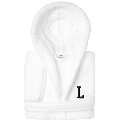 Personalized Linum Kids 100% Polyester SUPER PLUSH Double Brushed Hooded Bathrobe in Navy Script Font , White , Small