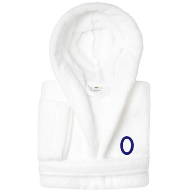 Personalized Linum Kids 100% Polyester SUPER PLUSH Double Brushed Hooded Bathrobe in Navy Script Font , White , Medium