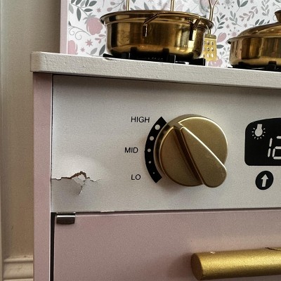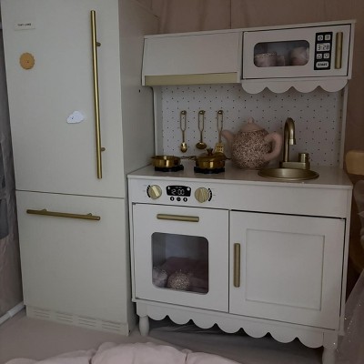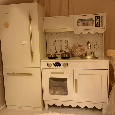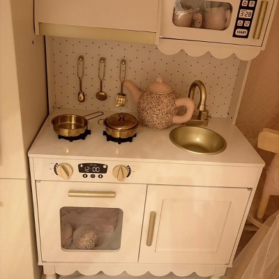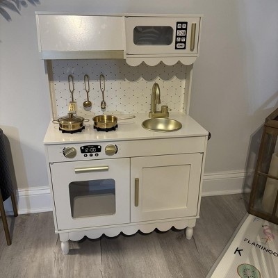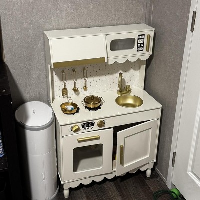 [This review was collected as part of a promotion.] We recently put together this wooden cottage style play kitchen and overall I’m really happy with it. Assembly was mostly straightforward. The instructions were easy enough to follow as long as you paused and really looked at what they were trying to say. Some of the wording felt a little strange, and there were no written directions for part 6 in step 1 of the pre-assembly, which threw me off for a minute. Once I figured that out, everything else went together pretty smoothly. Design wise it is so cute. The soft color and gold accents give it a really sweet, modern look that doesn’t feel cheap or overly plastic. The one thing I didn’t love is the section about the stove next to the microwave. There’s a little shelf space inside, but it doesn’t open or function, so it’s basically just decorative. I wish it used it as actual storage instead of just being there for looks. It comes with 5 metal accessories, which are adorable and feel sturdier than plastic ones that tend to crack or break. The only downside is the metal on metal sound when the kids scrape them with the utensils. Still, id rather have durable accessories than flimsy plastic ones. As far as value goes, you’re really paying for the aesthetic and sturdiness. It’s a solid wooden set that feels well made and looks beautiful, which makes it worth it in my opinion. A few small design tweaks would have made it perfect, but overall it’s a really cute addition to a playroom.
