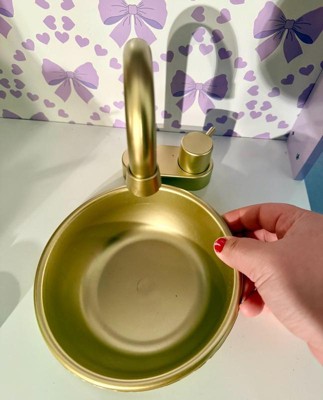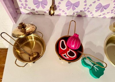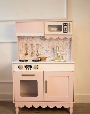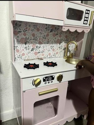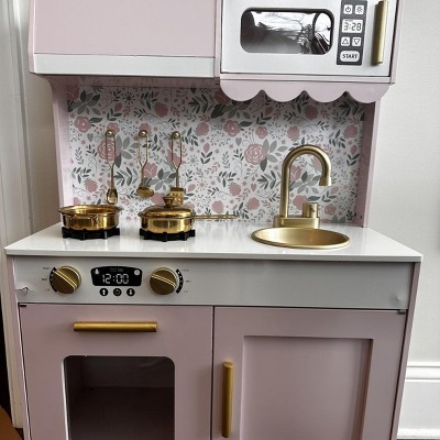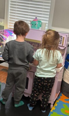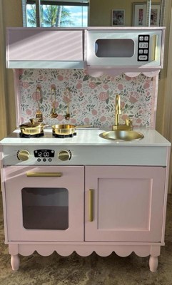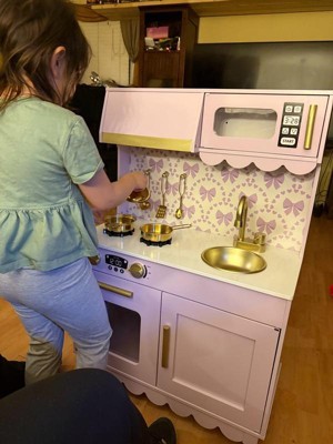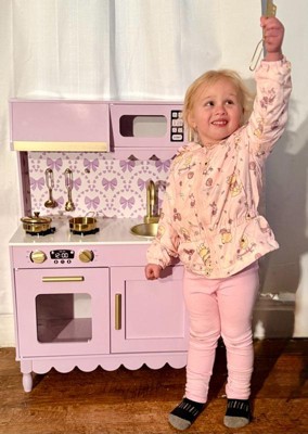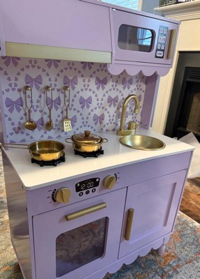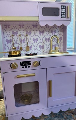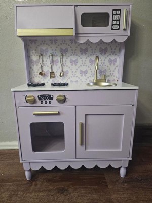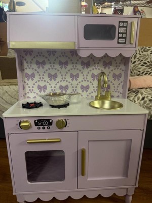 [This review was collected as part of a promotion.] This kitchen was the PERFECT addition to our playroom! We used to have a different one, but it was not nearly this nice! This kitchen has so many functional elements such as the faucet, opening microwave and oven, and the cabinet! It was one of the most difficult children’s toys I have assembled yet, but still very worth it! This kitchen is perfect for imaginative play and working on fine motor skills! My daughter loves to shadow me in the kitchen and this gives her the perfect opportunity to run her kitchen her way and be the head chef! I love the pretty purple color, gold handles, scalloped accents, and bow wallpaper! Definitely the sweetest little kitchen I ever did see!