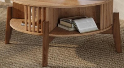 • Mid-Century Modern Coffee Table with Storage: Featuring a textured oak wood grain finish and solid rubberwood legs, this round table adds a stylish mid-century touch. Its versatile design complements various living room furniture and decor.