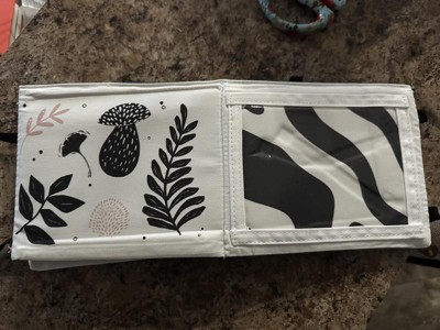 This is a high contrast fabric strip that can be used for tummy time entertainment. It came with card inserts and a mirror to change up some of the visuals. You could also tuck some 4x6 photos into the 4 available inserts. This folds up and would be easy to toss into a diaper bag or use in the car. I am not sure what the strings are on the ends however this is a nice product to gift a new little one with. Received free for review.