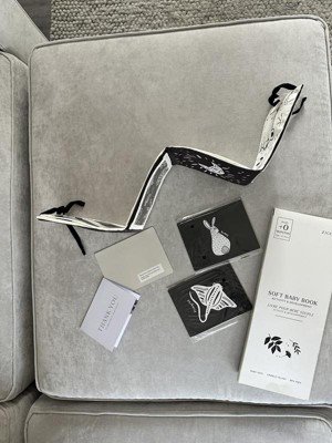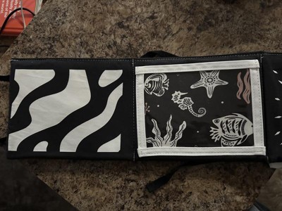 I love this black and white tummy time book. This is great for helping with developmental milestones. This book is soft to the touch with interchangeable black and animal cards. You could even put pictures of family memebers and loved on in them if you want. It folds up to a small compact easy to travel book!