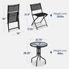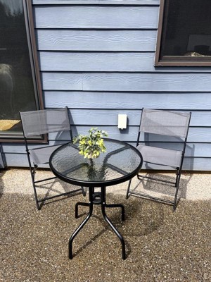 Treat yourself to an intimate outdoor dinner for two! This bistro set is made with a compact design, perfect for an elegant, space-saving addition on small patios, balconies, a deck, and more! A round, 24-inch tempered glass tabletop is easy to clean, with enough space to conveniently place food, beverages, and decor. With a 265lbs weight capacity, its chairs have a UV-resistant polyester mesh fabric that's lightweight & breathable, so your chairs are durable and easy to carry. The comfy & foldable chairs quickly fold down for easy storage or transportation after use. Plus, its sturdy, powder-coated (weather- and scratch-resistant) steel frame keeps your set stable and looking its best. Treat yourself to an enjoyable at-home dining experience again and again.