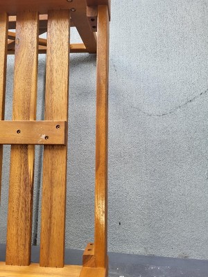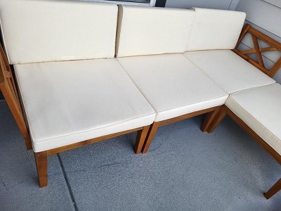 Wood base is stable, color of wood is much darker than the pictures online. The picture looks like a natural varnish/honey oak and the actual wood is closer to a chestnut or medium teak color. The staining on portions was scuffed in shipment. The cushions are very light and unsecured by straps except for the stool cushion. I expect these to blow away easily. I've bought quality Costway living room furniture items, but this set was a miss.