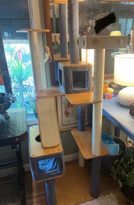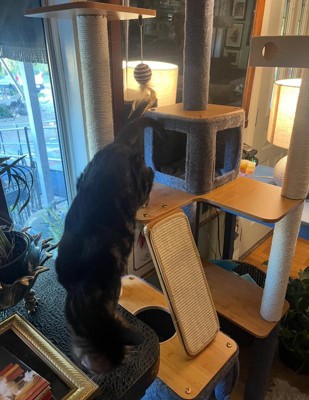 [This review was collected as part of a promotion.] This cat tee is amazing. It has everything any cat would like and need for play, exploring, and sleeping. It comes with 3 separate attached toys, a scratch pad, and two cubbies. It’s very sturdy and well made of heavy wood and nice carpet. It has multiple scratch posts and a detachable scratch pad. It’s tall but doesn’t take up a lot of space in your room. My cat loves this cat tower, he especially loves the wooden box with the jingle cat spheres. This is a 10 out of 10 I definitely do recommend.