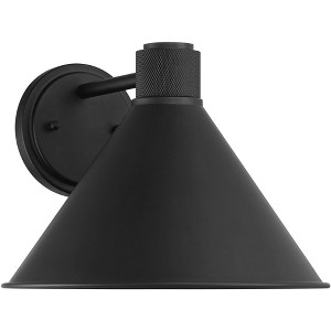 Simple and stylish, the Nathaniel outdoor wall light from the John Timberland® brand combines modern elegance with farmhouse charm. This unassuming design comes in a matte black finish with a metal shade, creating a sturdy appeal with conical design. The Nathaniel outdoor wall light is wet location rated for outdoor use.