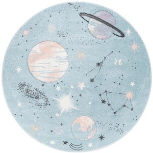 Discover a cosmos of comfort underfoot with our whimsical 5' 3"x5' 3" Round area rug. Crafted in Turkey using state of the art power loomed techniques, this rug is not only durable but also boasts a soft 5/8" polypropylene pile, designed to withstand the adventurous play of children while being easy to clean.