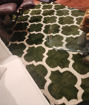 This rug is lovely! The dark green is very dark, but beautiful. It turned out to be too small for our space, but I may order in the next size. It arrived quickly and easily unfolded to lay flat. It also feels really good underfoot.