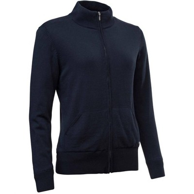 This cardigan will be a sweater-rotation favorite.This long-sleeve cardigan, crafted in a polyester blend with 93% polyester and 7% spandex, is enriched with the warmth of wool. Designed with a zip closure and mockneck, it features a cable knit front with flat knit sleeves and back for a textured touch. Ideal for both on and off the golf course, this cardigan includes front pockets and windproof lining, promising a comfortable, warm, and breathable wear.