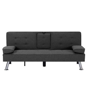 Dark gray Futon Sofa Bed, Modern Convertible Armrests Sleeper Couch with 2 Cup Holders,65.3”x 27.5”x 29” H