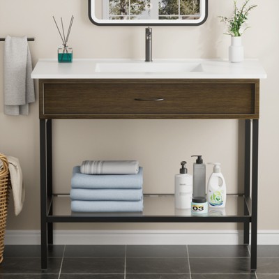 Bathroom Vanity with Resin Sink, Freestanding Modern Bathroom Cabinet Set with Metal Frame and Open Storage Glass Shelf