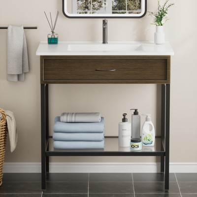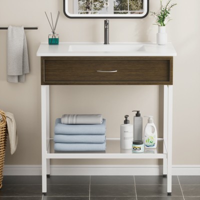 Bathroom Vanity with Resin Sink, Freestanding Modern Bathroom Cabinet Set with Metal Frame and Open Storage Glass Shelf
