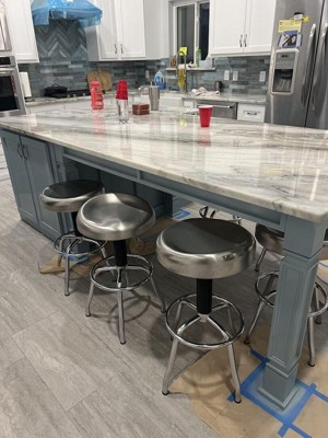 We now have six of these stools in our new kitchen. We have a large countertop height island and these stools work great! We did cut them down an inch by cutting each foot with a tubing cutter. Although we gained some knee room, we still have to use them fully bottomed out, so they have no spring left. We’re going to buy two more.