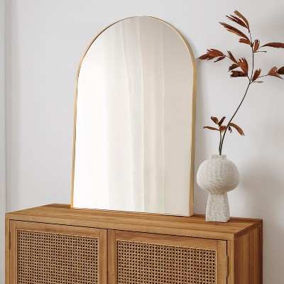 This sleek, modern mirror has a classic arched top that will add a vintage vibe to any space. The versatile wall-hung or leaning design is strengthened by a narrow metal frame. Its vertical orientation is ideal for a bathroom vanity, bedroom or entry area.