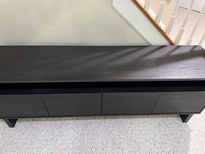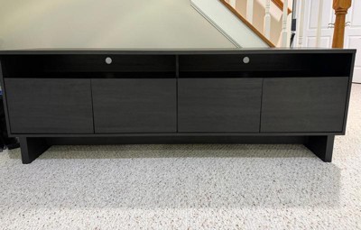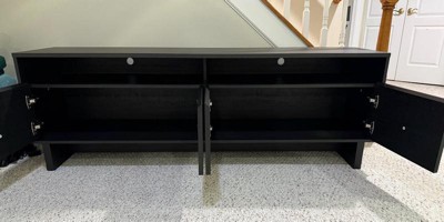 [This review was collected as part of a promotion.] This is such a great piece! We added it to our home office and it’s absolutely perfect. I love the minimalistic design and the dark tone is neutral enough that it can match a variety of wall colors and floor patterns. There are four doors across the bottom and shelves above to store media consoles or slim boxes. It is a wide piece of furniture, so it is perfect for extra storage and to hold a fairly large tv (our tv is mounted so can’t comment on how big of a tv it can realistically hold, but the description says 75” and I’m sure that’s accurate). If you’re familiar with building basic furniture pieces, this will be no problem to construct just by following directions and using basic tools. My husband had no problems putting it together. It is fairly heavy and big though, so you may need two people to get it into place. If you’re looking for a modern, yet minimalistic, tv stand, definitely check this one out. It’s a great value!
