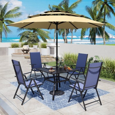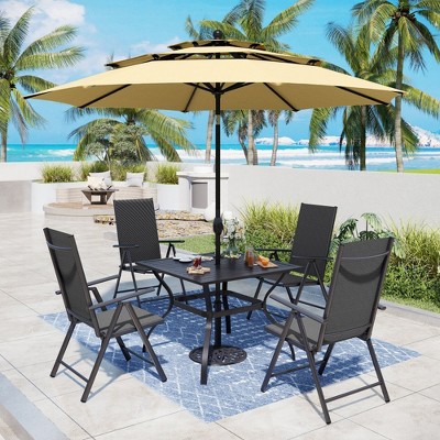 Captiva Designs 6pc Patio Slat-top Square Table & Textilene Reclining Foldable Chairs & Market Umbrella