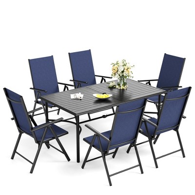 [CAPTIVA DESIGNS] Enhance your outdoor dining experience with our Complete Patio 6-piece Dining Set, featuring a stylish dining table, four comfortable armrest chairs, and a convenient market umbrella for shade. The durable steel table showcases a timeless slat design and includes a 1.57" umbrella hole.