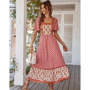 Women's Summer Boho Floral Print Dress Vintage Square Neck Ruffle Swing Flowy Beach Long Maxi Dress
