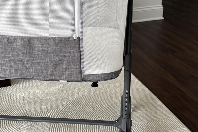 Easy to move from room to room thanks to the wheels. The size is perfect for a newborn, and it feels stable and secure. The adjustable height is very convenient, and the mesh sides allow good airflow for the baby.