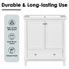 This vintage-style bathroom vanity with sink combo is crafted with a solid ceramic sink and a sturdy base made from solid wood and MDF boards, offering both functionality and timeless elegance. The smooth ceramic sink has a waterproof finish that resists water stains, and its pre-drilled three-hole design fits a 4" centerset faucet (not included). An integrated overflow with a metal circle helps prevent water spills. The vanity features a multi-functional cabinet with two-tier racks on each door for convenient storage of makeup and other small items, while the lower large drawer includes a removable section panel that can be adjusted to create customized storage. An adjustable shelf inside the cabinet allows for three different height settings, perfect for organizing bathroom essentials such as lotions, shampoo, and soap.