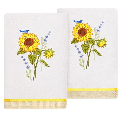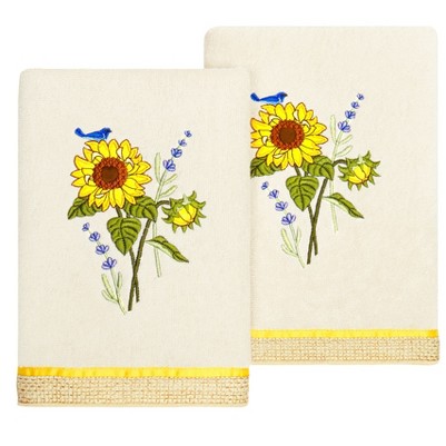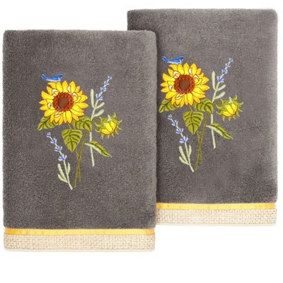 Create a mood of country charm in your bath with the GIRASOL Embellished Towel Collection. These towels feature an applique embroidered bouquet of vibrant sunflowers and lavender, highlighted by a bright bird perched on top. Cloud soft and super absorbent, these luxurious, durable towels keep their plush appearance after washing. This collection is available in 8 elegant colors: White, Beige, Blush, Aqua, Silver, Cocoa, Charcoal and Marine. The GIRASOL Towel Collection brings a natural spirit and richness to your home decor and makes a great gift!