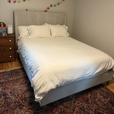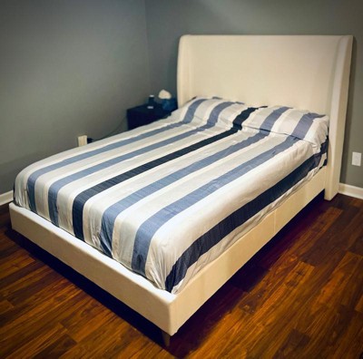 [This review was collected as part of a promotion.] This wingback upholstered bedframe gives a nice classic look. I love the ivory color! It has a padded headboard and cushioned sides with a metal and wood frame, wooden slats, steel rail and center legs. It's durable and can hold up to 1,000lbs. It would look great in the master bedroom or guest room!