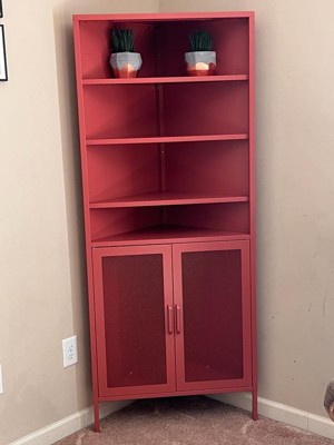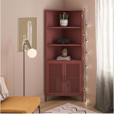 [This review was collected as part of a promotion.] This corner furniture piece came in a huge box with multiple pieces & all of the hardware. It looked a bit intimidating at first, but it only took about 30 minutes to assemble. I didn’t realize that it was metal, I thought it was wood from the picture. I didn’t think it would go well with my space, but it turned out beautifully! The terracotta color is also very pretty. I am happy with how it turned out and how it adds a pop of color to my living room. I plan to put pics on it and maybe books/magazines in the bottom storage area.