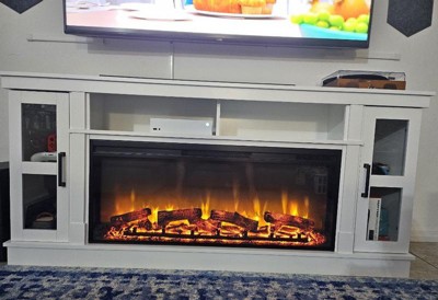 The Ameriwood Home Elmcroft Wide Fireplace Console for 75" TVs effortlessly combines contemporary style with practical features, making it an ideal addition to any living room or family room. Its clean lines and minimalistic moldings create a modern aesthetic. The side cabinets feature glass doors, adding a touch of elegance and allowing you to display your items. Behind the glass doors, the adjustable shelves provide flexible storage, while the open shelf above the fireplace accommodates electronic components. Designed for flat-screen TVs up to 75" and 95 lbs., this console features a 42" fireplace insert with a tempered glass front that stays cool and is safe around kids and pets. Use it with or without heat and enjoy the quiet fan-operated warmth. The realistic log and flame effect add ambiance, and cable wire management keeps cords out of sight. Constructed from sturdy MDF, this freestanding console is easy to install and enhances any living space. The TV Stand with Electric fireplace ships in two boxes and requires assembly by two adults. Assembled dimensions: 70.07" W x 31.49" H x 18.11" D.