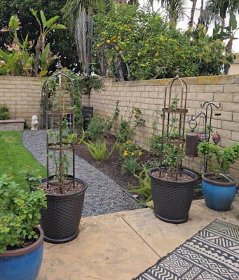 So I bought the larger version (think 7') obelisk a couple years ago and this has held up well! Both strength and durability. The powder coat truly does protect against rusting (I do put it away in winter). It's so beautiful and adds an elegance to what I like to dub my English garden even tho it gives me more French vibes due to the design style(haha). So when I needed another for my new morning glory plant I decided to just stay with the same design so the two opposing garden spaces would have a more seamless flow and compliment each other. It wasn't a second thought to purchase the 5' obelisk! You will not regret this purchase.