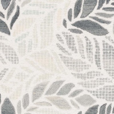 The rug features an exquisite ivory and grey color palette that exudes a serene and inviting ambiance. The interplay of the two neutral shades enhances the botanical pattern showcased in the image, with elegant leaves gracefully strewn across the rug's surface to create a harmonious and organic look that is versatile enough to complement any interior design scheme.